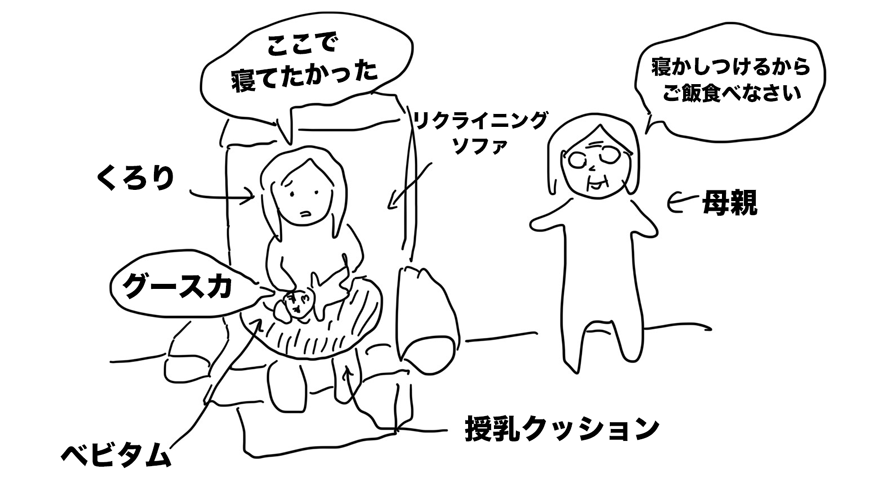 毎日トラブル続きの里帰り出産。最近はベビーベッドに無理に戻さず、リビングのリクライニングソファでベビタムと一緒に寝るのが主流になりつつある。