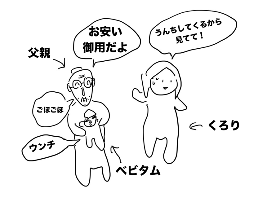 朝ごはん後、うんこが漏れそうだったのだが、ベビタムを父親に預けられたので、無事に漏らすことなく排便することができた。