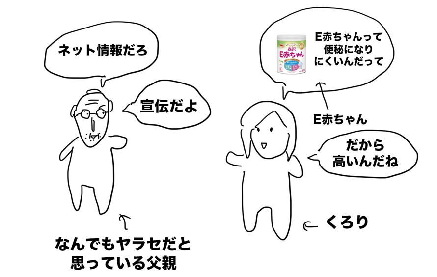 くろり「話は変わるけど、E赤ちゃんって、便秘になりにくいらしい。それで高いのかもね」