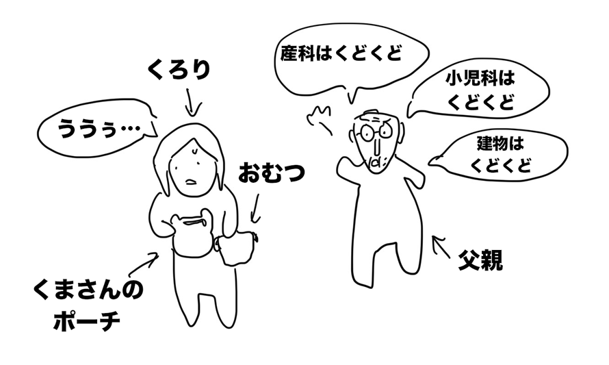 あと、父親がお医者さんのサインについて、あまりにもしつこかったので、「まずは総合受付で聞くんだよ」的なことを言ったら、「産科はくどくど、小児科はくどくど、建物が違うくどくど、、」と逆にこじれて、クソしんどかった。