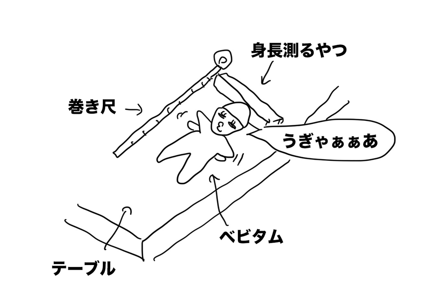 まずは、体重と身長。赤ちゃんは固定させようとすると暴れるので、身長の測り方は結構ガバガバ。