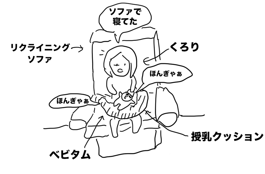 リビングのリクライニングソファでミルクをあげ、ベビーベッドで寝かしつけようと試みるも、すぎに起きてしまうので、リビングに戻って、ソファでベビタムと一緒に寝ることを決意。