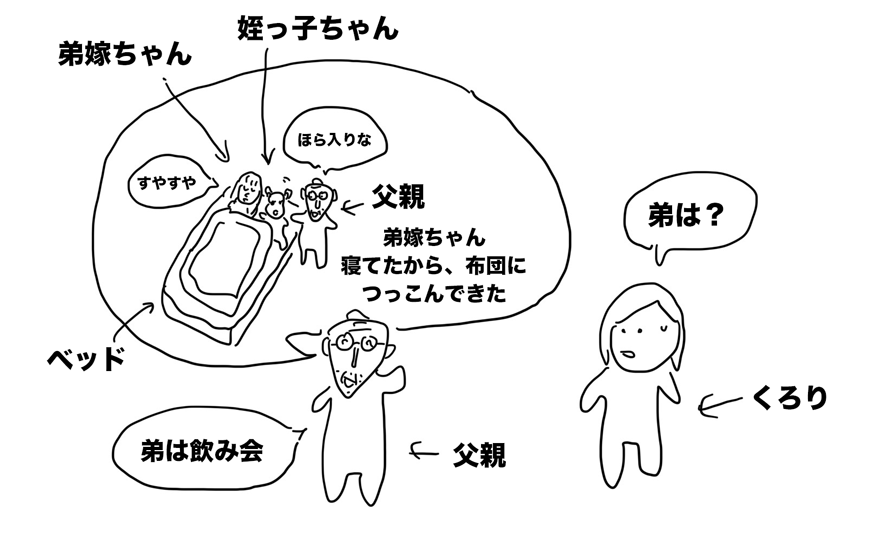 父親「弟宅行ったら、弟嫁ちゃんがもう布団で寝てたから、その中に姪っ子ちゃんを入れてきた。それで、洗濯物をまとめてあげて、それから帰ってきた」