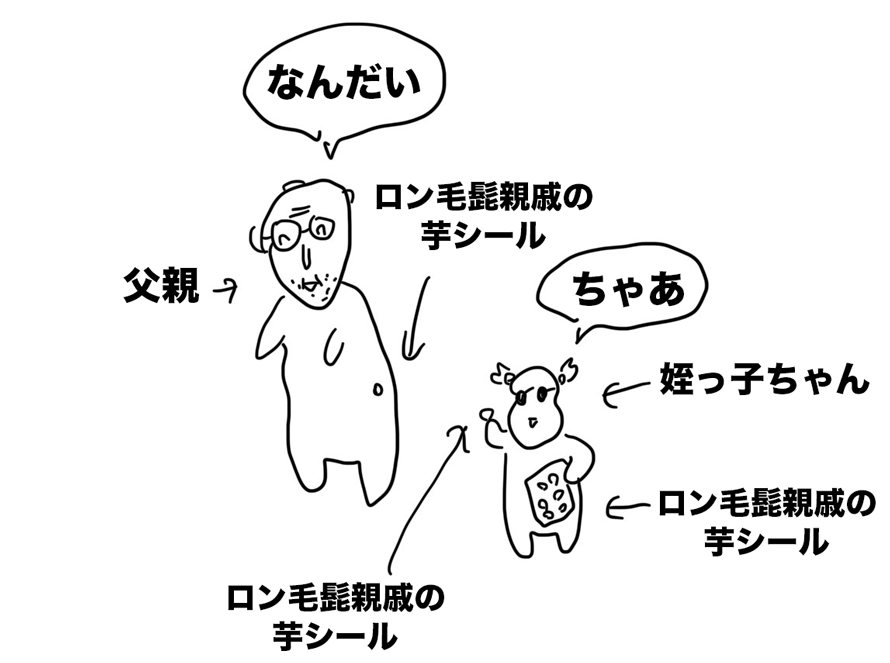 その後、姪っ子ちゃんはロン毛ヒゲ両親から届いたロン毛ヒゲ親戚の芋についてきたシールを所構わず貼っていた。