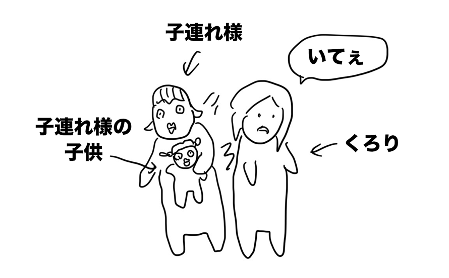 向かっている途中、娘を抱っこしている子連れ様に体当たりされて、くたばれよと思った。