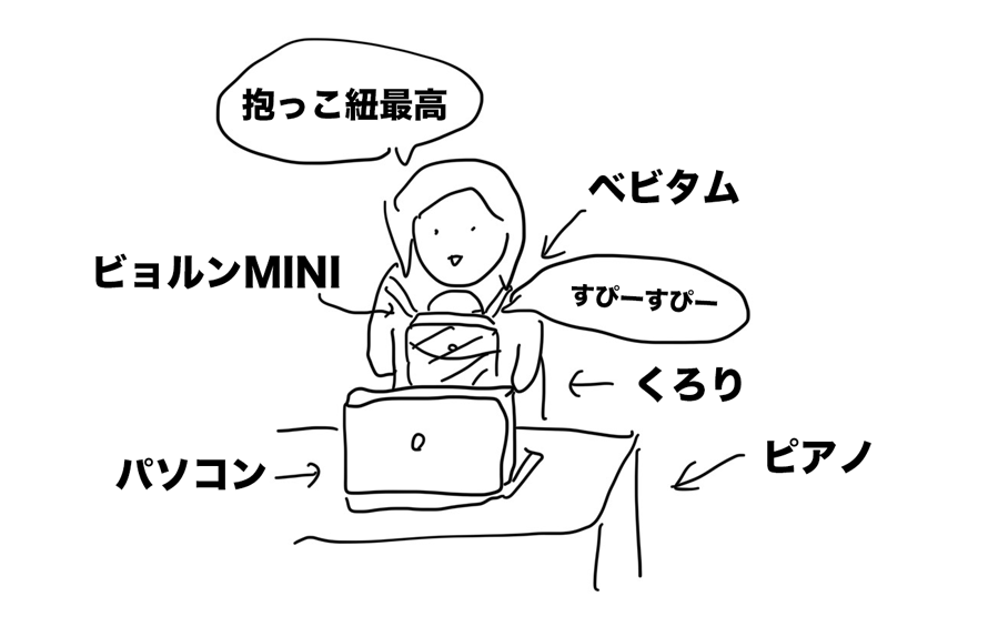 夜は、ちょっと作業がしたかったので、買ったばかりのビョルンMINIを装着して、立ちながらPC作業。