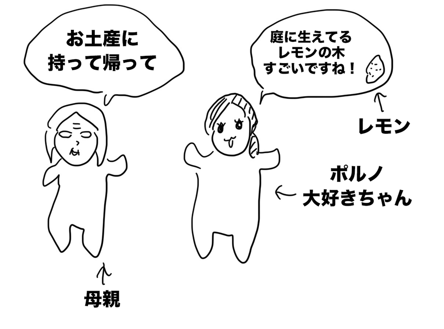 そのまま家に入り、お土産のケーキを母親に渡すなり、レモンの木を褒めるポルノ大好きちゃん。