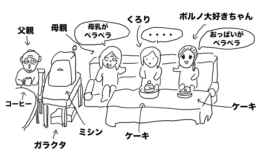 そのまま2人でリビングに行き、ケーキを食べていると母親がやってきて、ソファに座って会話に入ってくる。