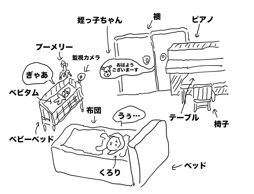 ベビタムとともに部屋ですやすや寝ていると、玄関から大きな声が。