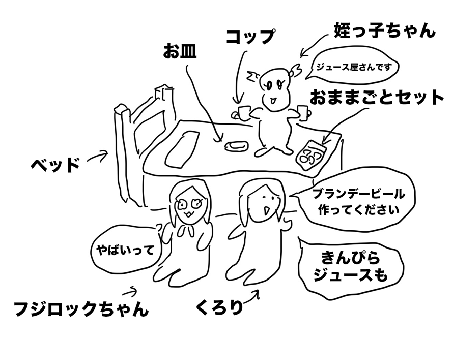 3歳児が困惑する注文をしていると、見るに見かねたフジロックちゃんが姪っ子ちゃんの相手をはじめる。