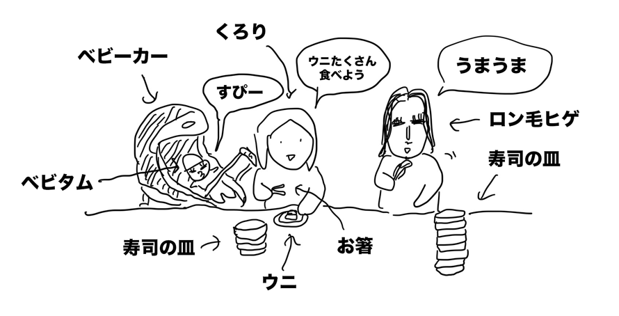 ロン毛ヒゲは、私がトイレにいた間に何個か寿司を食べていたよう。
