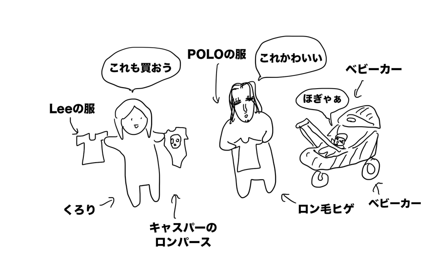 LEEとPoloのかっこいい洋服や、恐竜のもこもこ洋服、NIKE洋服セット、キャスパーのオーバーオールなど、ベビタムの服に課金していく我々。
