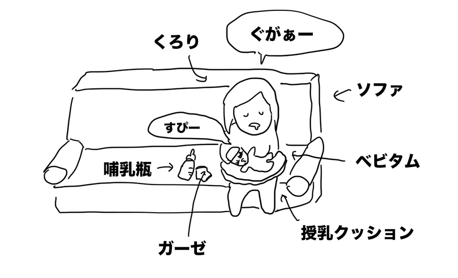 ミルクを飲んだ後の寝かしつけも、ベッドに戻すとゲップが足りなくて苦しいのか辛そうにすることがあるので、そのままソファで腕の中で寝かし続けるという手法。
