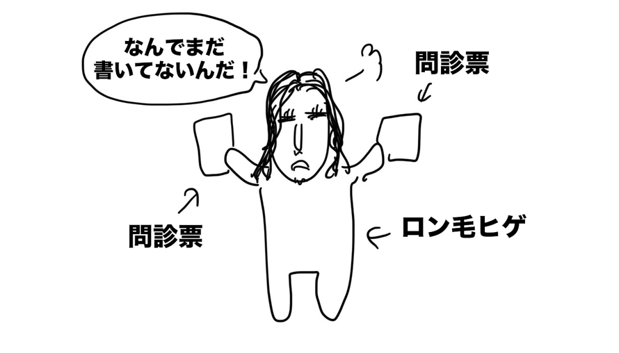 ついこの間、ロン毛ヒゲに「なんで問診票まだ書いてないんだ!」と怒られたのだが、基本的にこれは直前に書くものなので怒られるのは違うと思う。