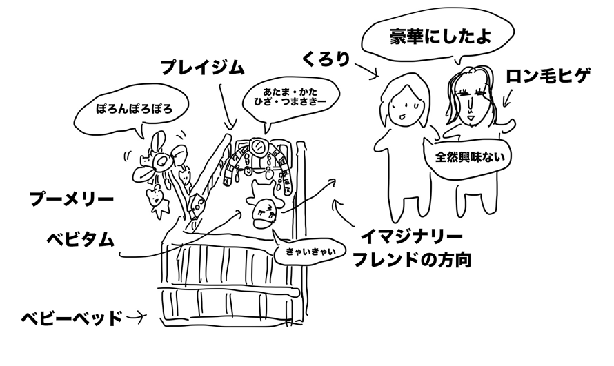 とりあえず、ベビタムをベビーベッドに乗せて、イマジナリーフレンドと勝手に遊んでもらおう。