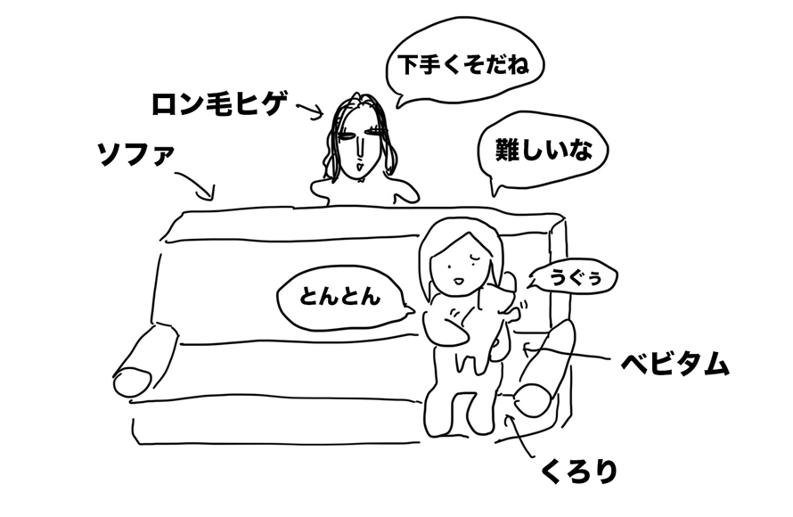 私は、ミルク後にベビタムにゲップをさせるのが下手くそだ。なので、途中でロン毛ヒゲにパス。