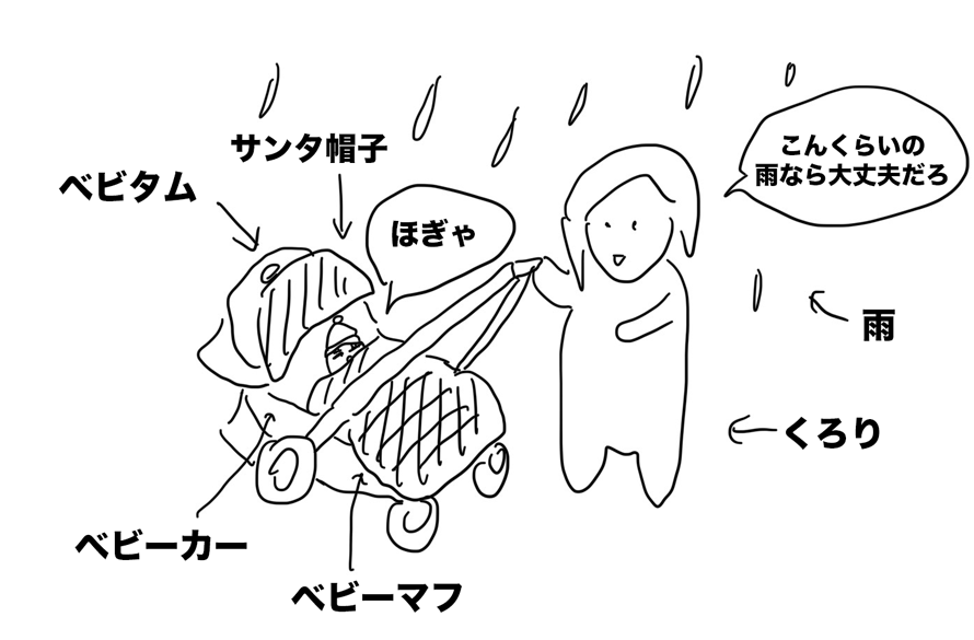 小雨になるまで待って、ベビタムにサンタ帽子を被せ、雨に濡れながら20分ほど歩き、イオンモールに到着した。