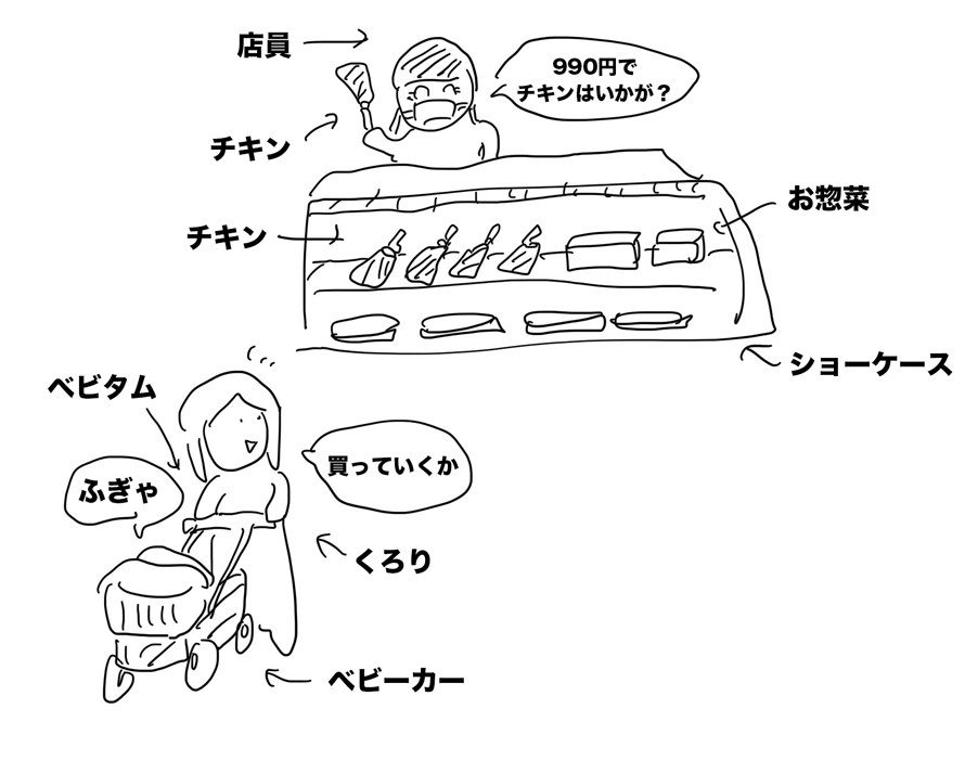 高そうな肉やお惣菜が入ったガラス張りのカウンターからおばさんが呼びかけている。