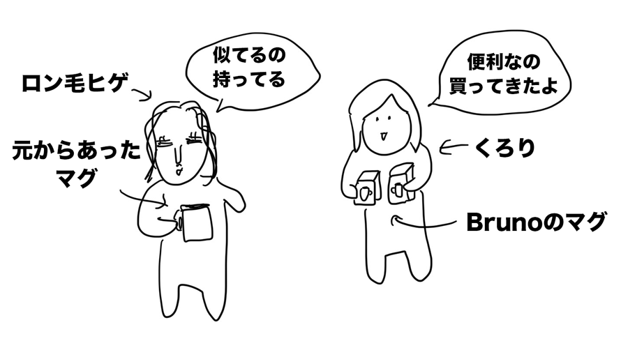 寝転がった時に使える細型枕か、ブルーノの蓋付きマグ、どちらにするか悩んだが、自分も欲しかったのでマグ2つを購入した。