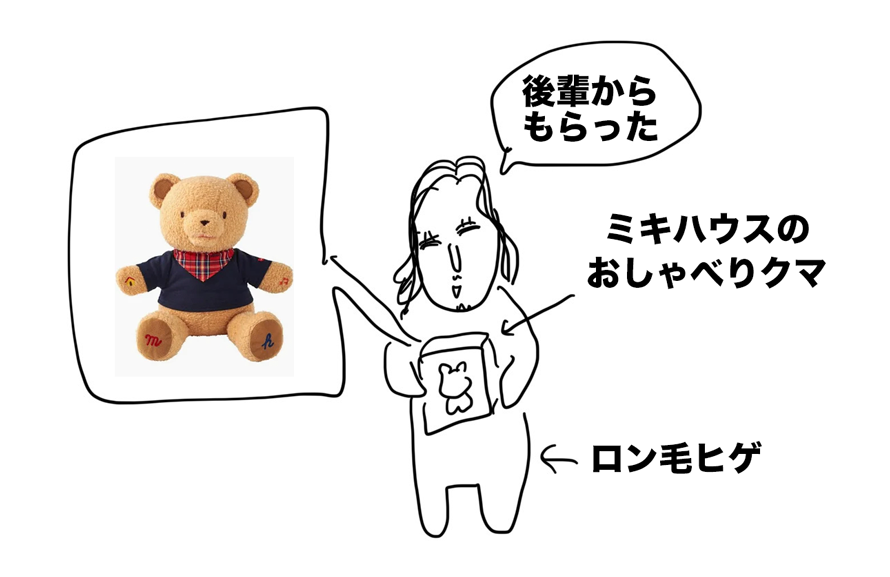 帰宅して開封すると、なんとミキハウスの喋る熊のぬいぐるみだった。