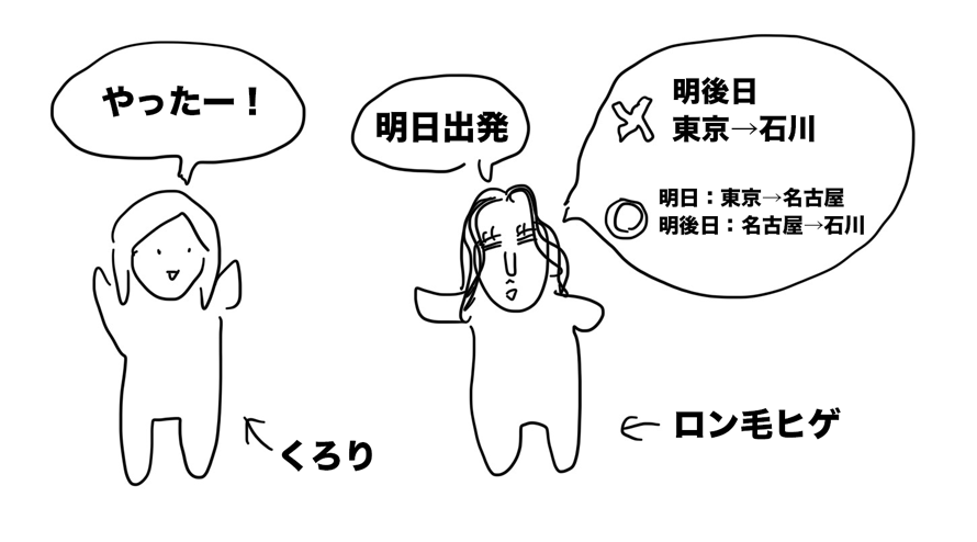 ロン毛ヒゲ「なので、明日の夜出発して、明後日朝に名古屋到着、その夕方に石川へ向かいます」