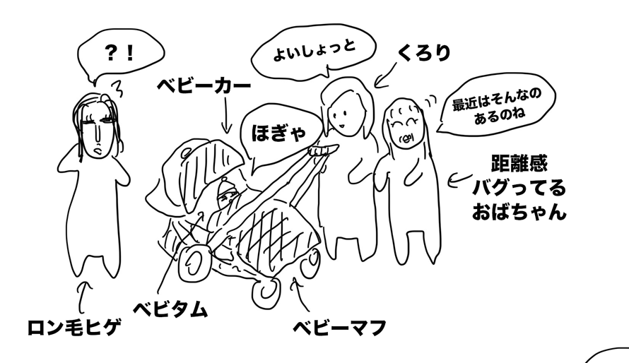 イオンモールの入り口で、ベビーカーにノースフェイスのベビーマフも装着していると、髪の長い女性が声をかけてくる。