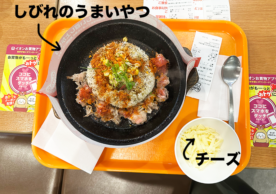 注文したのはペッパーランチのしびれ的なやつ。ロン毛ヒゲは三田製麺のつけめん特盛。