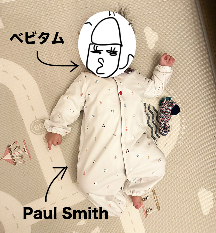 ベビタムはだいぶ身体が大きくなっていたので、脳外科医ちゃんからもらったポールスミスの洋服でも着せてみよう。
