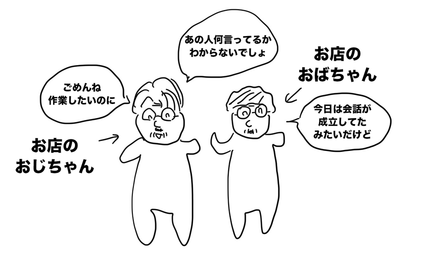 おじおば「ごめんねえ、作業したいのに。あの人何言ってるかわからないでしょう」