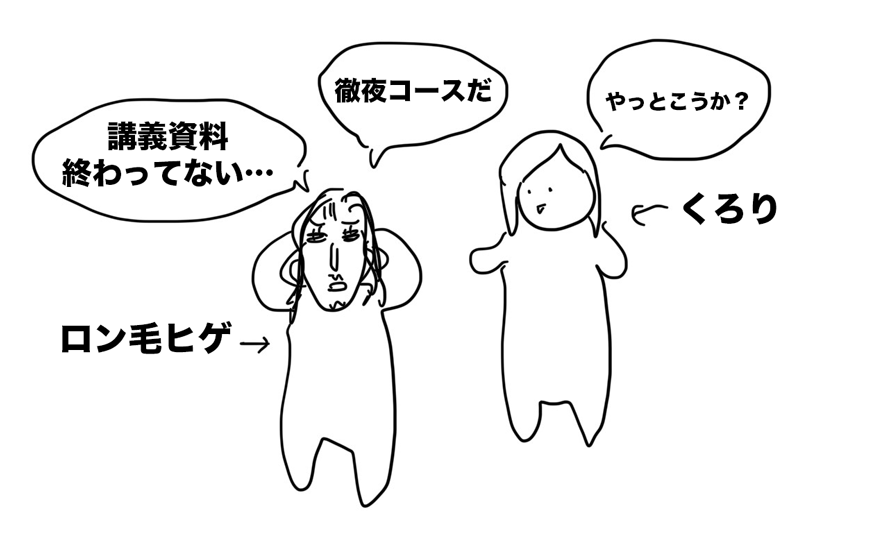 ロン毛ヒゲ「今日、徹夜コースだ・・」