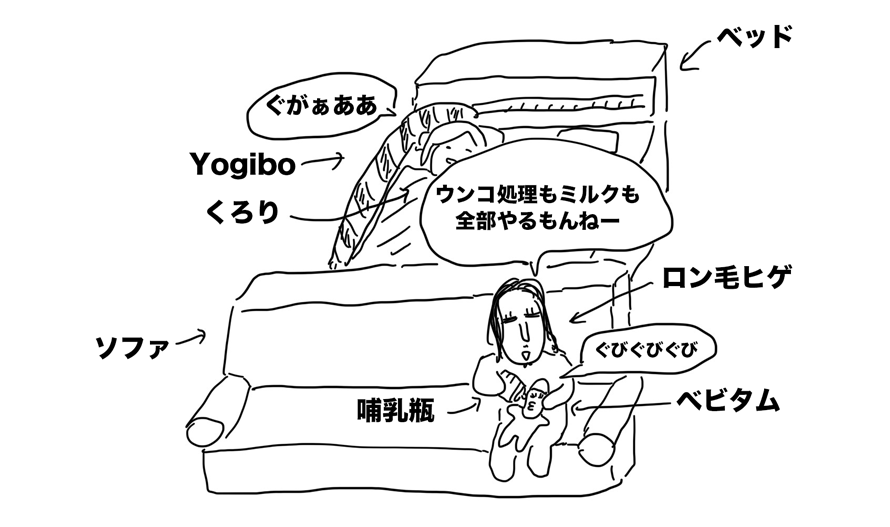 ベビーベッド側で寝ていたので、朝はロン毛ヒゲが起き上がりうんこ処理したり、ミルクあげたり。