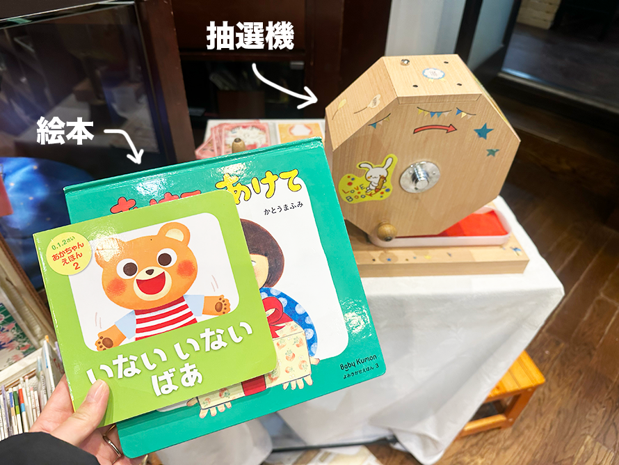 景品の絵本ゾーンにある本はどれも月齢が高そうだったため、店員さんがわざわざ裏からベビー向けを持ってきてくれた。