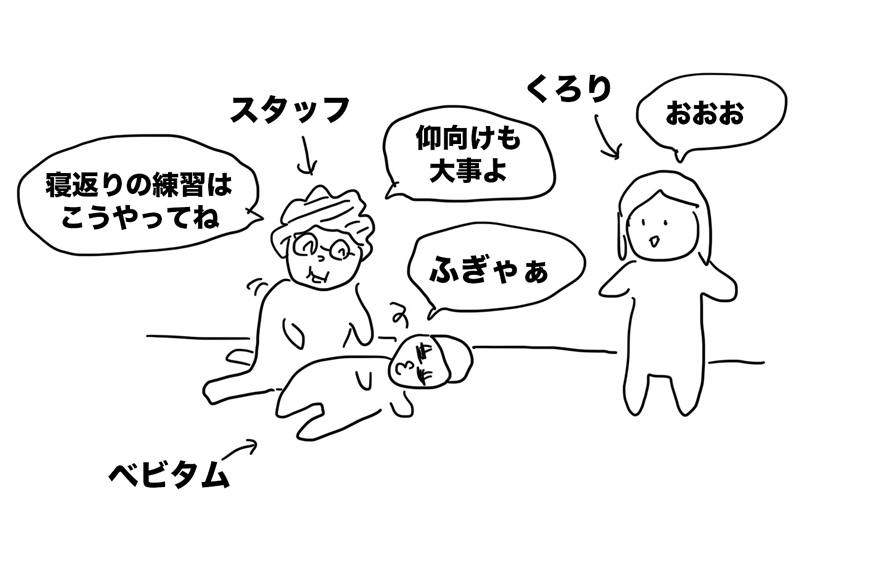 スタッフの人「あおむけで寝かせて、足バタバタさせるのも大事よ」