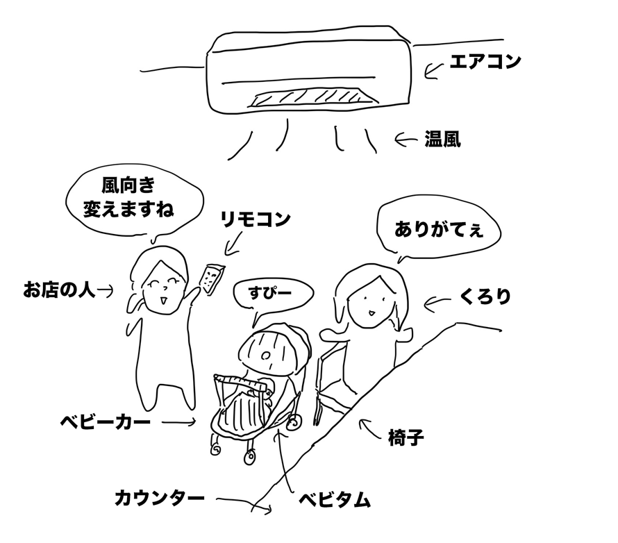 ベビタムに当たらないように、エアコンの風向きを変えてもらった結果、ちょい寒かった。