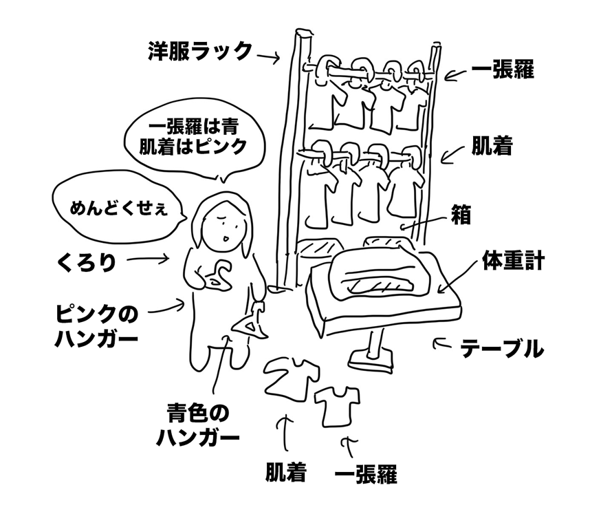 肌着をピンク色、一丁らを青色のハンガー・・と仕分けていると・・