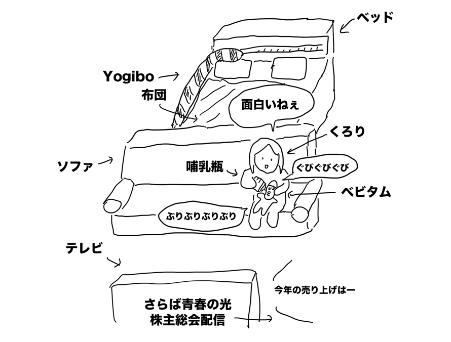 ベビタムと昼寝している間に、ロン毛ヒゲも帰ってきていたようで、気づくとYogiboで唸りながら寝ている。