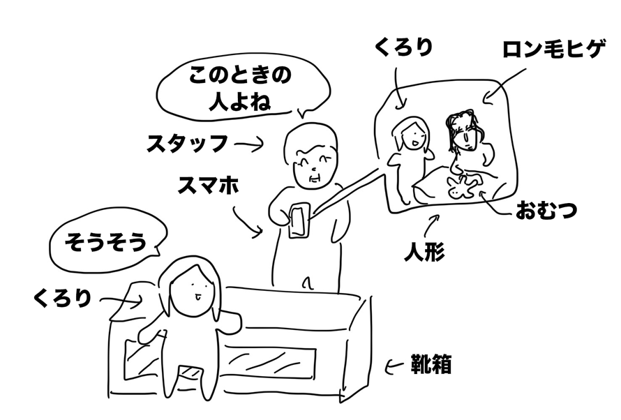 当日の写真を見せてくるスタッフ。ロン毛ヒゲが赤ちゃんの人形を着替えさせている写真だ。