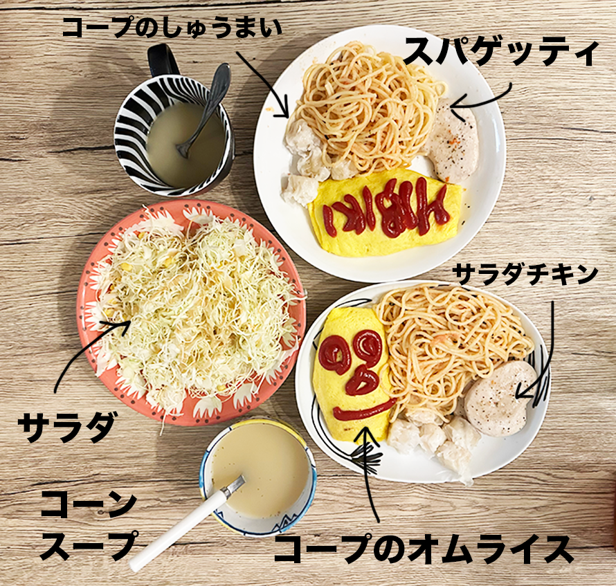 そして、帰りが遅くなるロン毛ヒゲのために、コープの冷凍フードを使ってお子様ランチを準備した。
