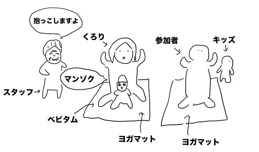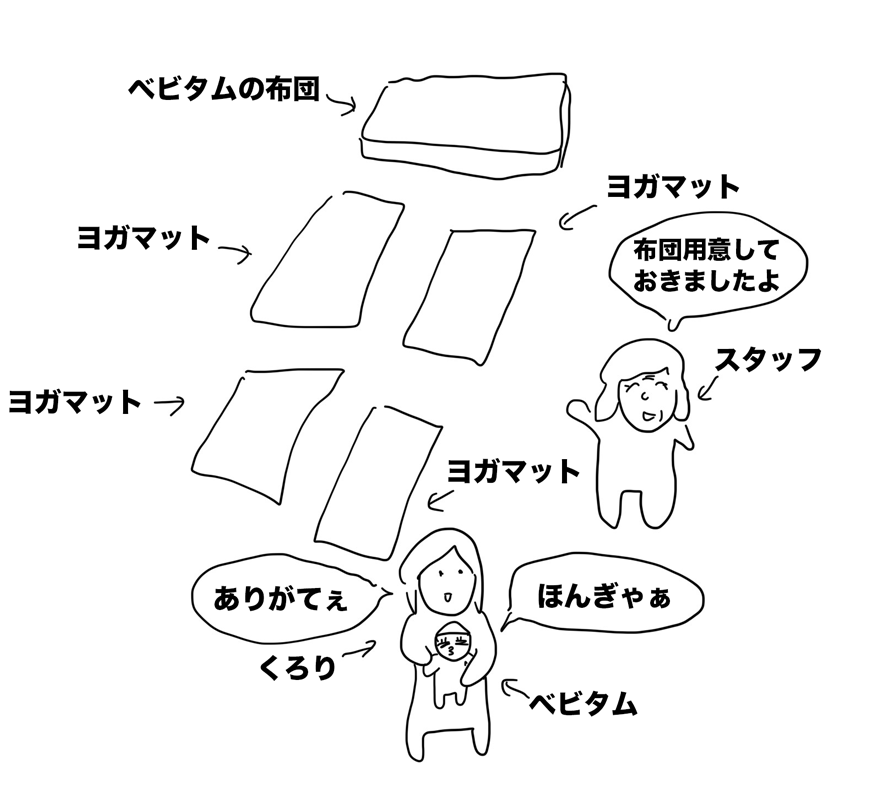 前回と同様、スタッフがベビタム用の布団を用意してくれていたので、ベビタムはその上に転がしてヨガ開始!