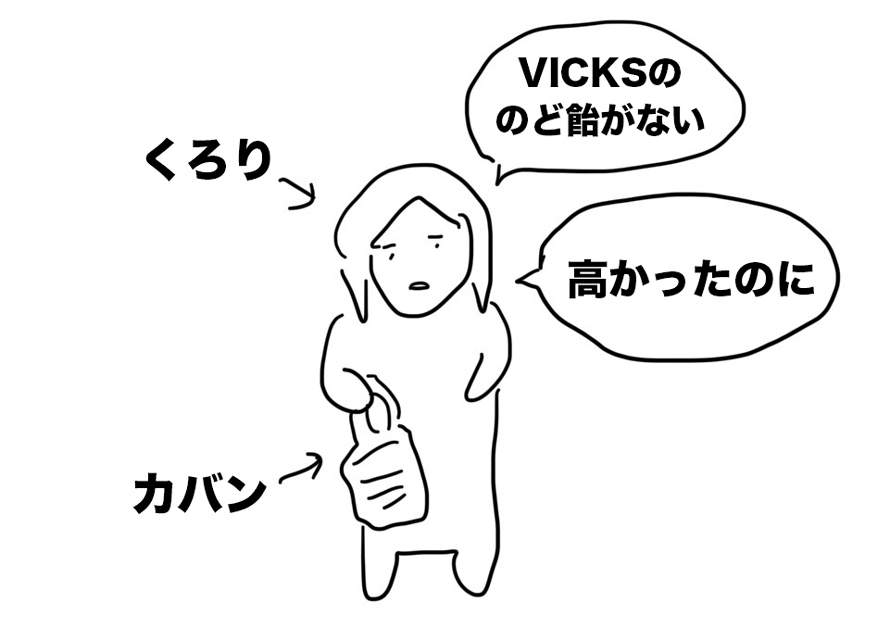ついでに喉も痛かったので、VICKSの高いのど飴を購入したが、秒でなくして残念だった。
