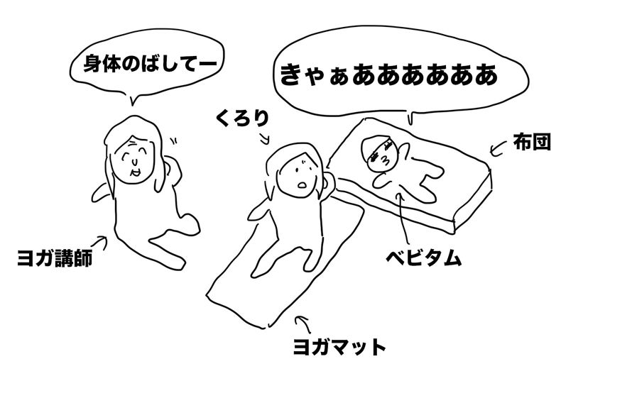 仕方なく、ベビタムを抱っこしながらヨガをしていたら、見かねたスタッフが預かってくれ助かった。