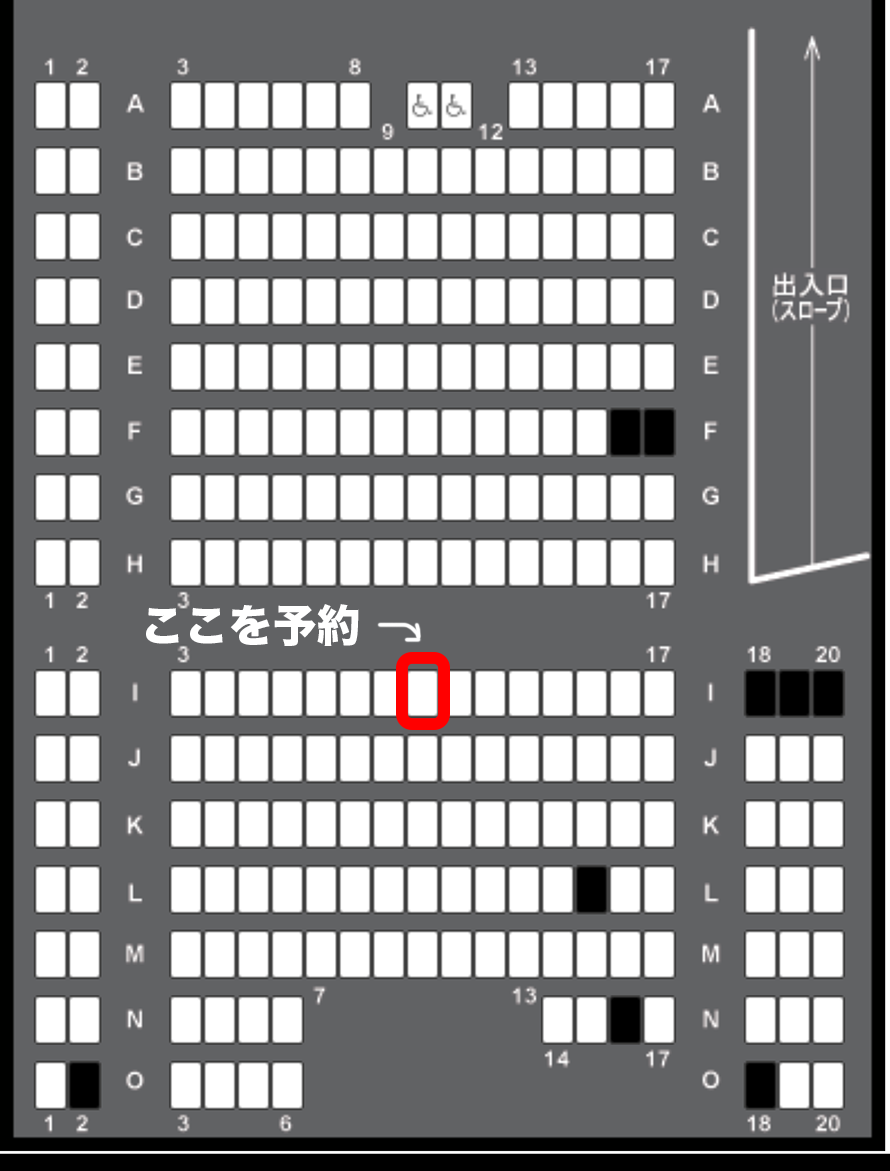 席を予約しようとしたら、みんな気を遣ってか、端っこの席がちらほら埋まっているだけだったので、空気を読まずに真ん中中央の席を予約した。
