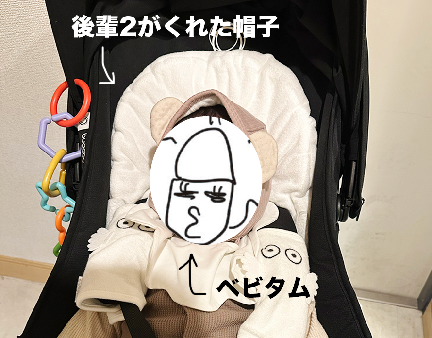 ということで、急いで着替えて、ベビタムはパジャマのまま、靴下と後輩2にもらった帽子を装着して出発した。