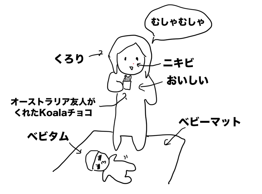 腹が減ったので、ベビタムを転がせながらロン毛ヒゲのカップ麺とオーストラリアの友人がくれたチョコレートをむしゃむしゃ。