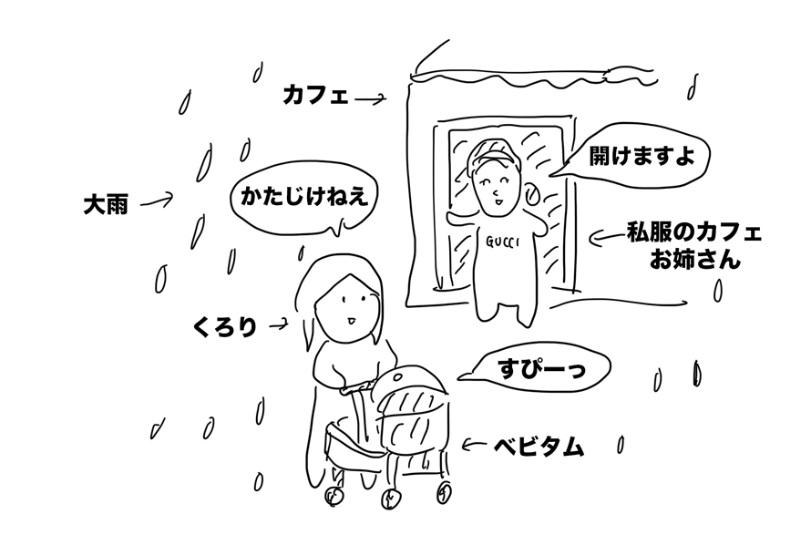 しかし、大雨の中、傘をさしてくれて、マンションの階段でベビーカーを持ち上げるのを手伝ってくれたので感謝である。